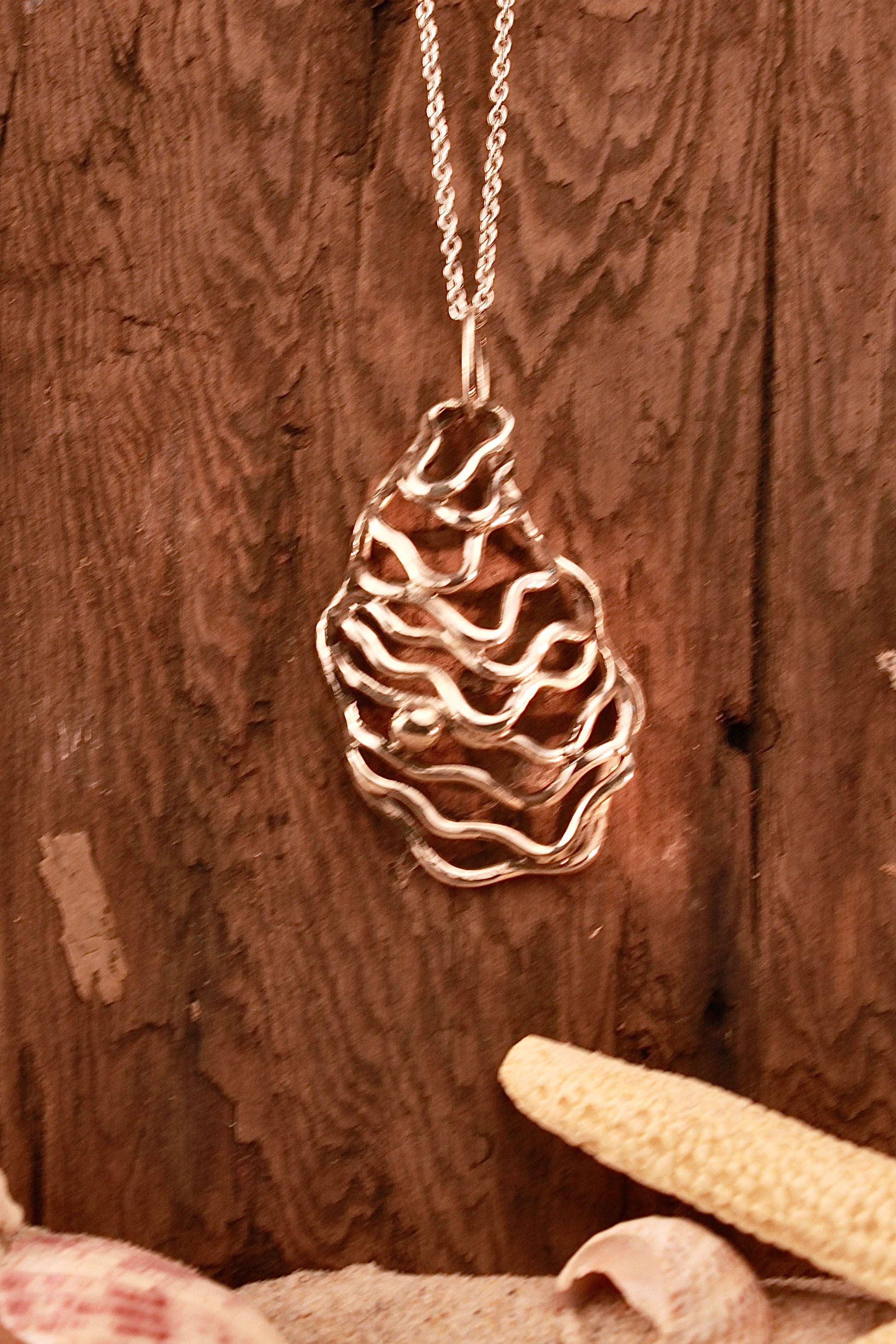 Handmade Sterling silver oyster shell pendant with sterling pearl