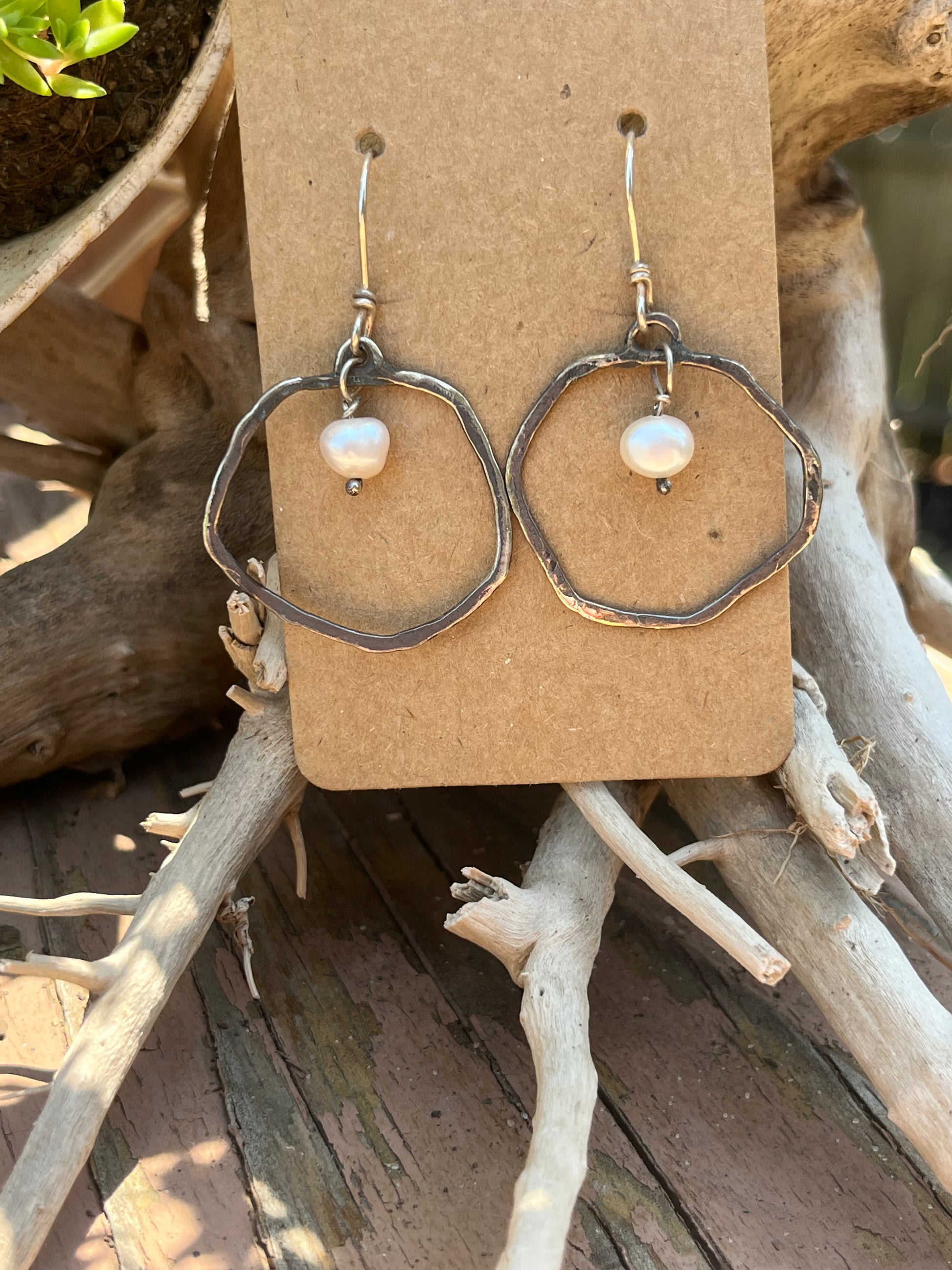 Hand hammered and formed rustic sterling silver hoop with a fresh water pearl