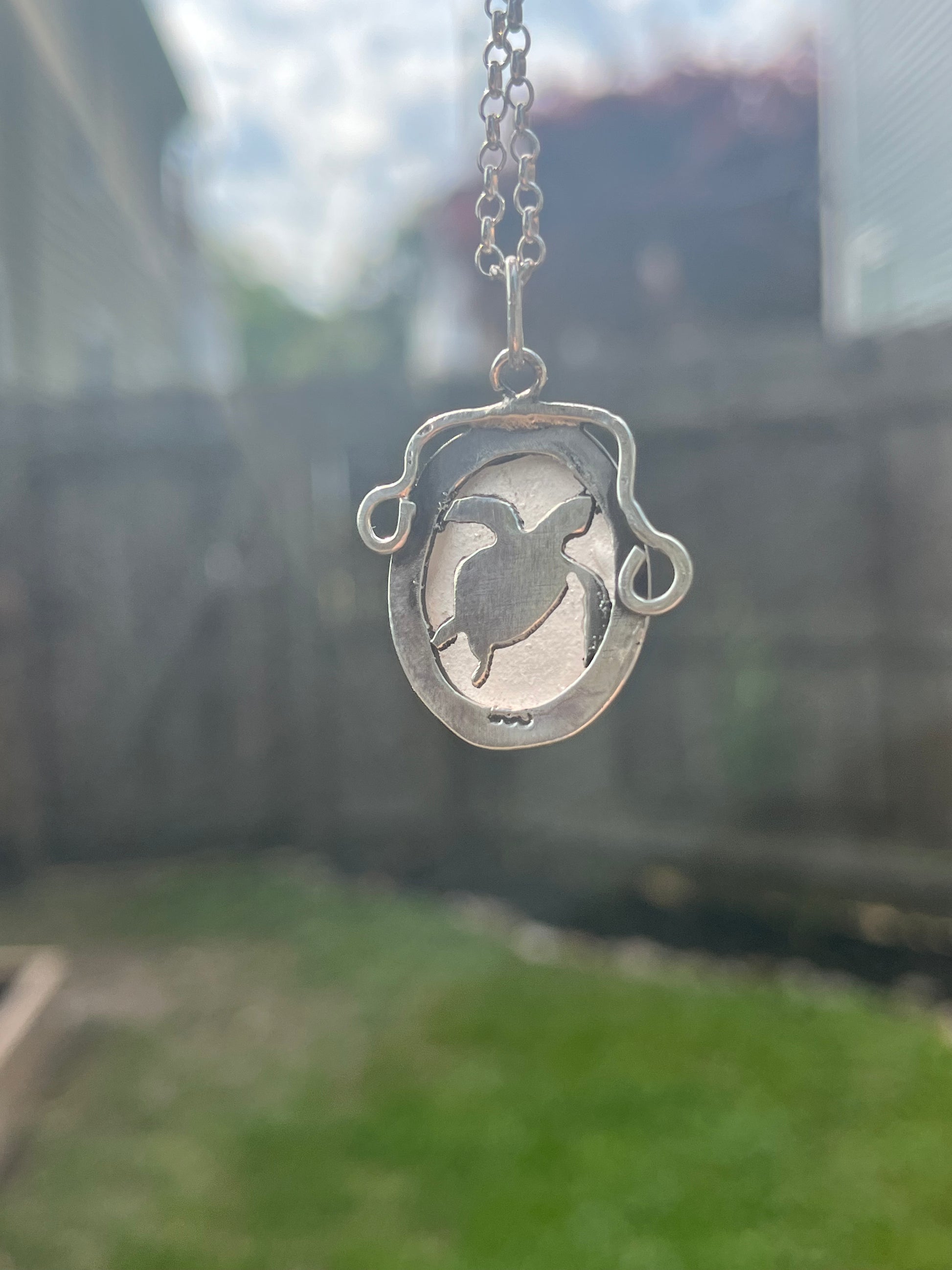 Sterling silver holding sea glass with the silhouette of a sea turtle which can be seen when light passes through the glass